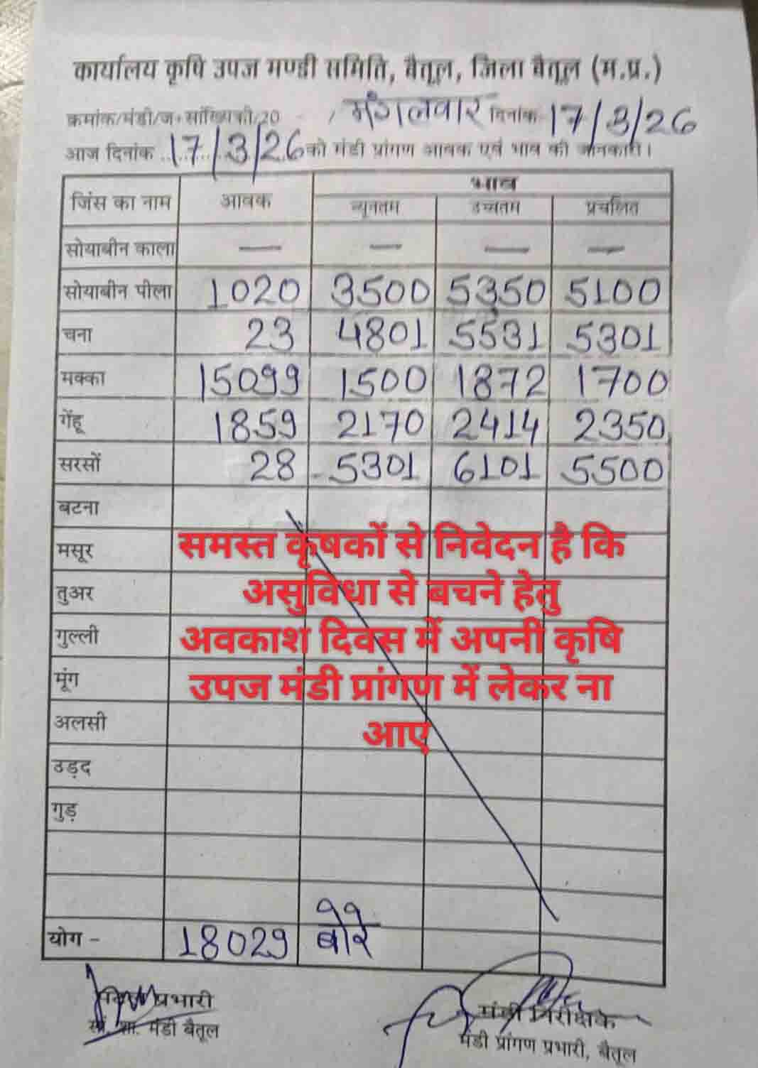 Betul Mandi Bhav 17 March: बैतूल। कृषि उपज मंडी बैतूल में 17 मार्च 2026 को विभिन्न कृषि उपज की कुल 18029 बोरी आवक दर्ज की गई। मंडी में सबसे अधिक आवक मक्का की रही, जबकि सोयाबीन, गेहूं, चना और सरसों की भी अच्छी मात्रा में आवक देखने को मिली। मंडी प्रांगण में दिनभर किसानों की आवाजाही बनी रही और अलग-अलग उपज की नीलामी व्यापारियों द्वारा की गई। बुधवार के बाद लगातार 4 दिनों तक मंडी बंद रहेगी।