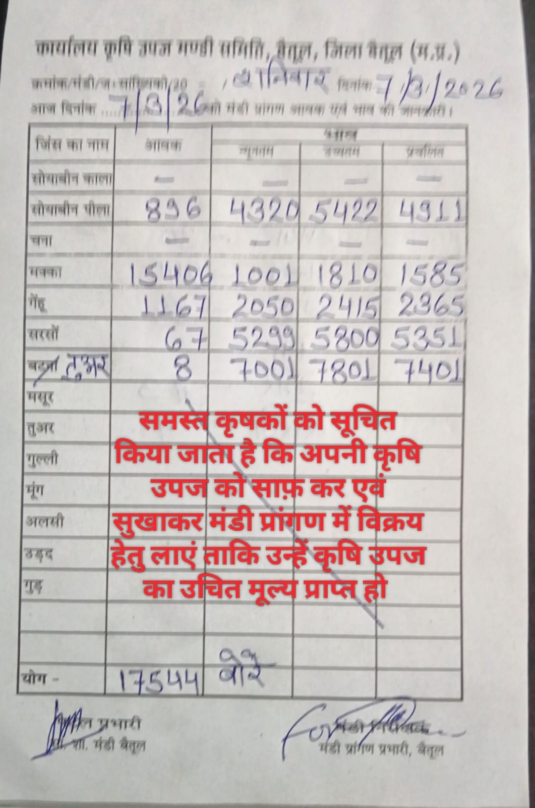 कृषि उपज मंडी बैतूल में आज 7 मार्च 2026 की आवक और भाव