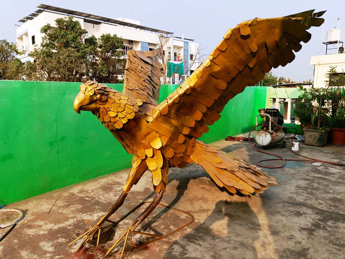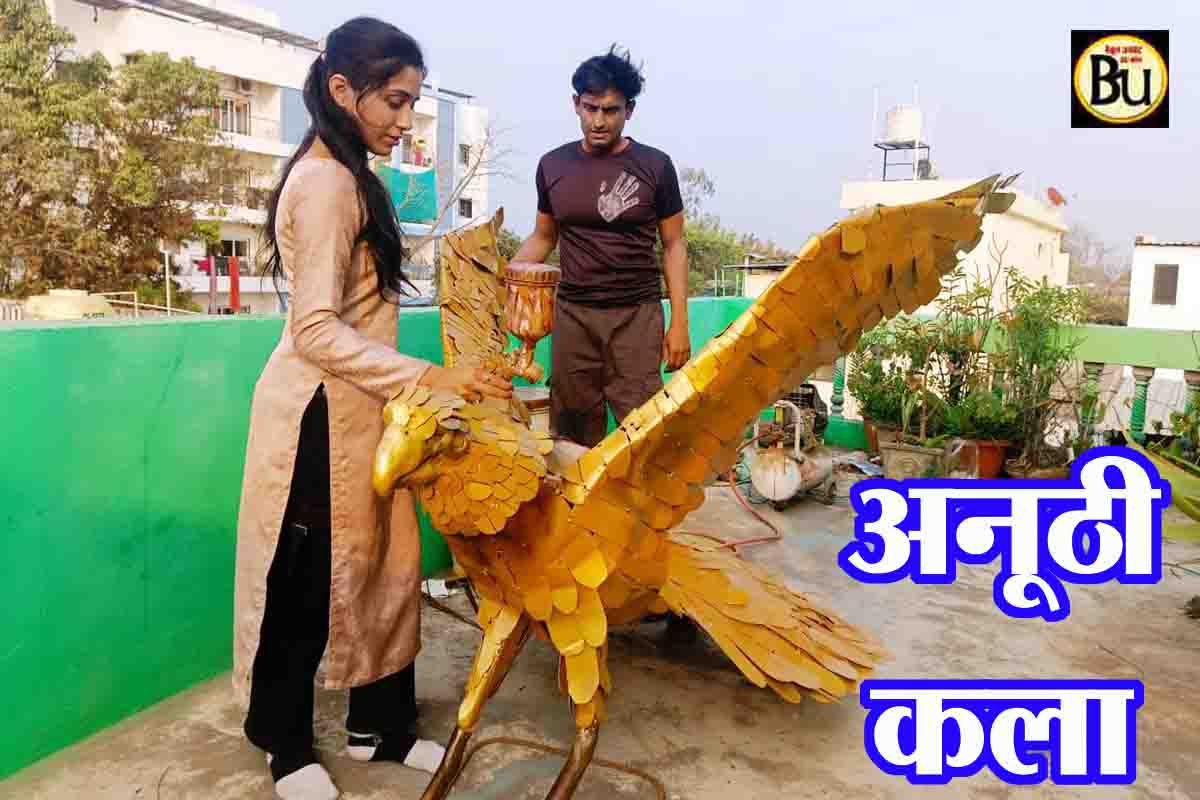 हिंदू धर्म में गरुड़ को शक्ति, साहस और अटूट भक्ति का प्रतीक माना जाता है। भगवान विष्णु के वाहन के रूप में पूजित गरुड़ को रक्षा, तेज और नकारात्मक शक्तियों के नाश का द्योतक भी समझा जाता है। इसी दिव्य स्वरूप को धातु कला के माध्यम से जीवंत रूप देने का प्रयास युवा चित्रकार और कला गुरु श्रेणिक जैन तथा उनकी शिष्या उमा सोनी ने किया है।