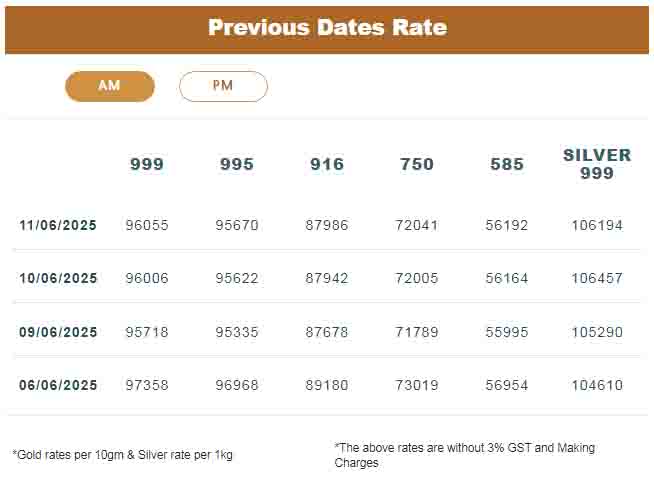 आल इंडिया सर्राफा एसोसिएशन मुंबई द्वारा गुरुवार 12 जून 2025 को जारी सोना-चांदी के भाव के अनुसार 999 शुद्धता वाले (24 कैरेट) सोने के 10 ग्राम के भाव आज सुबह 97164 रुपये के साथ शुरू हुए हैं। कल यह 96055 रुपये के साथ शुरू हुए थे और रात को 96235 रुपये पर बंद हुए थे।
