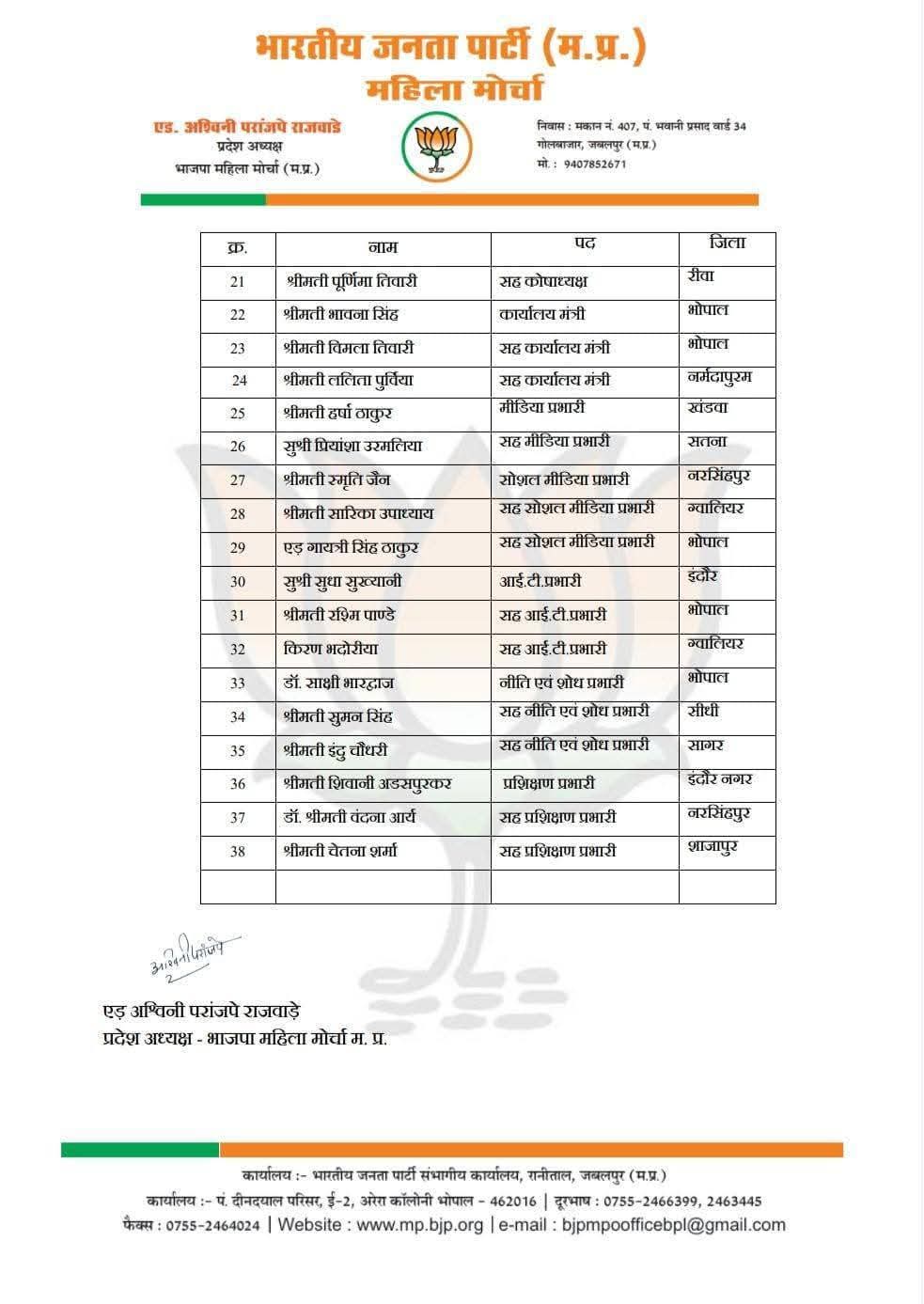 वहीं महामंत्री पद पर सिवनी से ज्योति सिंह राजपूत, सतना से डॉ. सपना वर्मा और राजगढ़ से मोना सुस्तानी को नियुक्त किया गया है। इनके अलावा मंत्री पद पर भी कई नामों को शामिल किया गया है, जिनमें मंडला से शशि पटेल, ग्वालियर से खुशबू गुप्ता, मुरैना रीना दंडोतिया, बैतूल से ममता मालवी, खंडवा से चारुलता यादव, सिंगरौली से सीमा जायसवाल, ग्वालियर से अंजली रायजादा और उज्जैन से प्रमिता यादव को अवसर दिया गया है। इससे स्पष्ट है कि पार्टी ने क्षेत्रीय संतुलन और अनुभव दोनों का ध्यान रखा है।