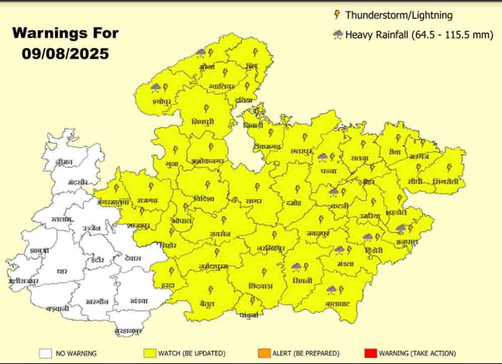 मौसम विभाग ने आज जिन जिलों में भारी बारिश का अलर्ट जारी किया है, उनमें श्योपुर, मुरैना, पन्ना, कटनी, अनूपपुर, डिंडोरी, मंडला, सिवनी और बालाघाट शामिल हैं। इन जिलों में 24 घंटों में 64.5 से 115.5 मिलीमीटर तक बारिश होने की संभावना जताई गई है। इन जिलों के लिए यलो अलर्ट जारी किया गया है। शेष जिलों में भी गरज-चमक और हल्की बारिश की चेतावनी दी गई है।