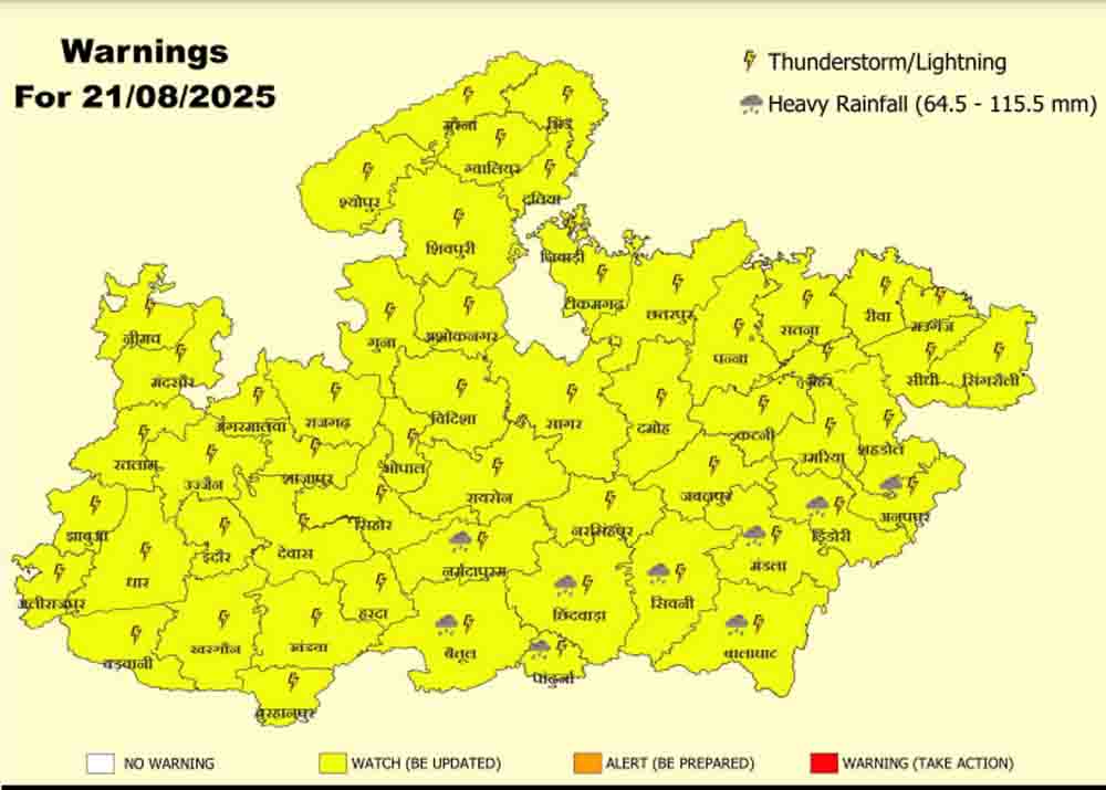 मौसम विभाग ने गुरुवार को भी कई जिलों में भारी होने का यलो अलर्ट जारी किया है। मौसम विभाग के अनुसार कल बैतूल, पांढुर्णा, छिंदवाड़ा, नर्मदापुरम, सिवनी, बालाघाट, मंडला, डिंडोरी और अनूपपुर में भारी बारिश हो सकती है। इन जिलों में भी 64.5 से 115.5 मिलीमीटर तक बारिश हो सकती है। वहीं अन्य जिलों में भी बारिश का मौसम बना रहेगा।