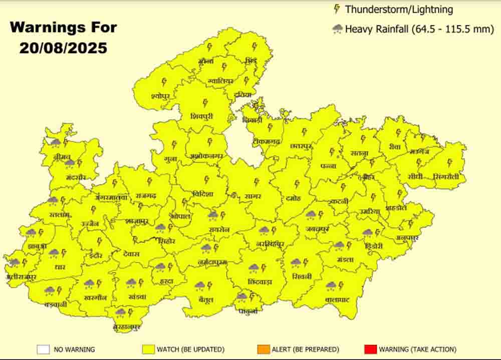 मौसम विभाग ने बुधवार को नीमच, मंदसौर, रतलाम, झाबुआ, अलीराजपुर, धार, बड़वानी, खरगोन, बुरहानपुर, खंडवा, हरदा, सीहोर, रायसेन, नर्मदापुरम, बैतूल, नरसिंहपुर, छिंदवाड़ा, पांढुर्णा, जबलपुर, सिवनी, डिंडौरी, मंडला और बालाघाट जिलों में भारी बारिश होने का यलो अलर्ट जारी किया है। इन जिलों में 64.5 से 115.5 मिलीमीटर तक बारिश हो सकती है। भोपाल, इंदौर, उज्जैन और ग्वालियर में हल्की बारिश होने के आसार है।