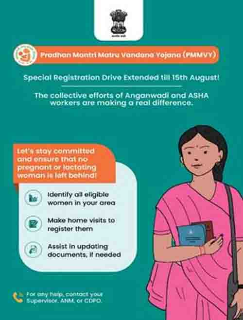 PMMVY Registration Campaign: नई दिल्ली। महिला एवं बाल विकास मंत्रालय ने प्रधानमंत्री मातृ वंदना योजना (पीएमएमवीवाई) के लिए विशेष पंजीकरण अभियान की अवधि 15 अगस्त, 2025 तक बढ़ा दी है। इसके तहत आंगनवाड़ी और आशा कार्यकर्ताओं के नेतृत्व में घर-घर जाकर जागरूकता एवं नामांकन अभियान का उद्देश्य सभी पात्र गर्भवती और स्तनपान कराने वाली महिलाओं तक पहुंचना और योजना के तहत उनका समय पर पंजीकरण सुनिश्चित करना है।