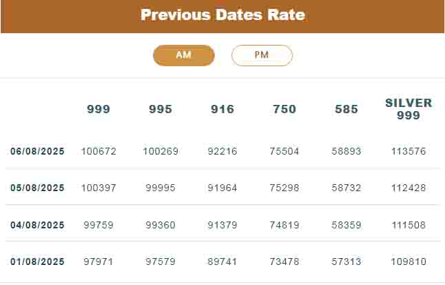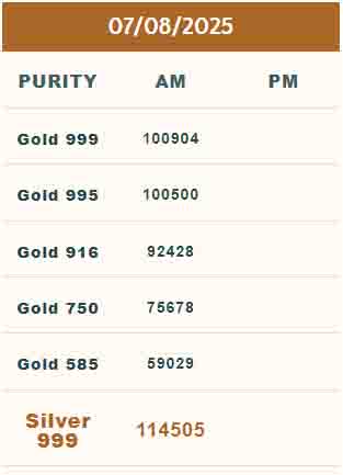 आल इंडिया सर्राफा एसोसिएशन मुंबई द्वारा 7 अगस्त 2025 को जारी भाव के अनुसार आज 999 शुद्धता वाले सोने के भाव 100904 रुपये प्रति 10 ग्राम है। इसी तरह 995 शुद्धता वाले सोने के भाव 100500 रुपये, 916 शुद्धता वाले सोने के भाव 92428 रुपये, 750 शुद्धता वाले सोने के भाव 75678 रुपये और 585 शुद्धता वाले सोने के भाव 59029 रुपये हैं। इसी तरह 999 शुद्धता वाली चांदी के 1 किलोग्राम के दाम 114505 रुपये हैं।