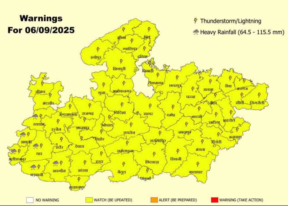 मौसम विभाग ने जानकारी दी है कि अगले 24 घंटों में रतलाम, झाबुआ और अलीराजपुर जिलों में बारिश का जोर सबसे अधिक रहेगा। यहां करीब आठ इंच से ज्यादा पानी गिरने की संभावना है। इन जिलों के लिए ऑरेंज अलर्ट जारी किया गया है।