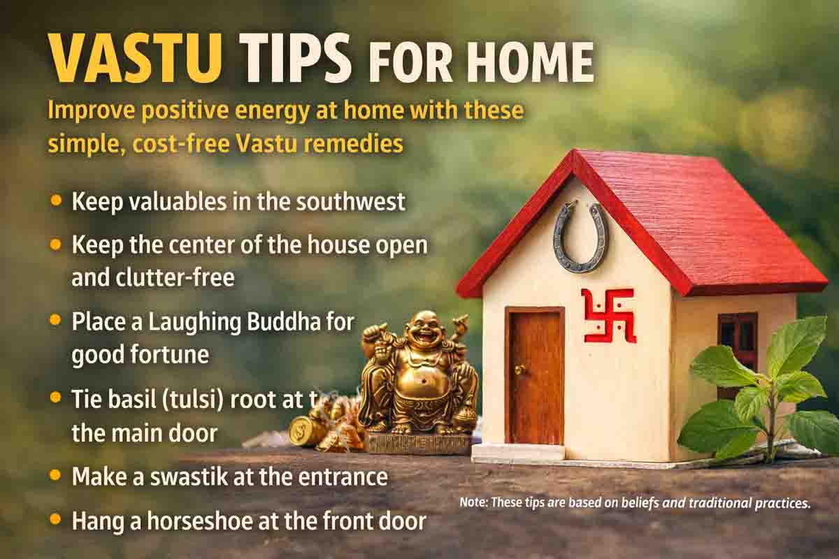 Vastu Tips for Home: घर का वातावरण केवल उसकी बनावट या सजावट से ही नहीं बनता, बल्कि उसमें मौजूद ऊर्जा का भी बड़ा असर होता है। वास्तु शास्त्र के अनुसार यदि घर की दिशा, वस्तुओं की स्थिति और कुछ परंपरागत नियमों का ध्यान रखा जाए तो जीवन में सुख-शांति और समृद्धि बनी रहती है। कई बार लोग यह मानते हैं कि वास्तु दोष को ठीक करने के लिए बड़े बदलाव या खर्च की जरूरत होती है, जबकि कुछ आसान उपाय ऐसे भी हैं जिन्हें अपनाकर बिना खर्च के घर की नकारात्मकता कम की जा सकती है।